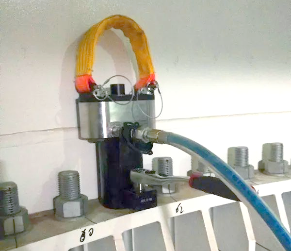 液壓拉伸器通過泵站壓力表實(shí)現(xiàn)精確的定值緊固,同步分流閥的設(shè)計(jì)使得一個(gè)泵站能同時(shí)驅(qū)動(dòng)多個(gè)液壓拉伸器對(duì)多個(gè)螺栓進(jìn)行同步拉伸,從而確保所有螺栓同時(shí)達(dá)到預(yù)定的載荷值。